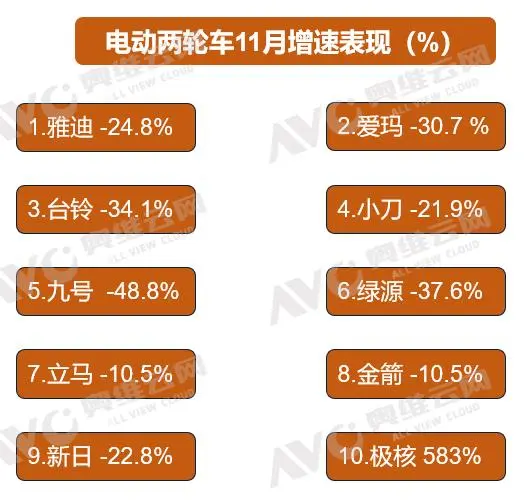 行业数据显示,雅迪11月内销同比下降24.8%,爱玛下滑30.7%,台铃降幅达34.1%。智能电动车品牌九号公司受影响最为明显,销量同比减少48.8%。与之形成对比的是高端电摩市场,极核品牌凭借高性能产品实现583%的逆势增长。
