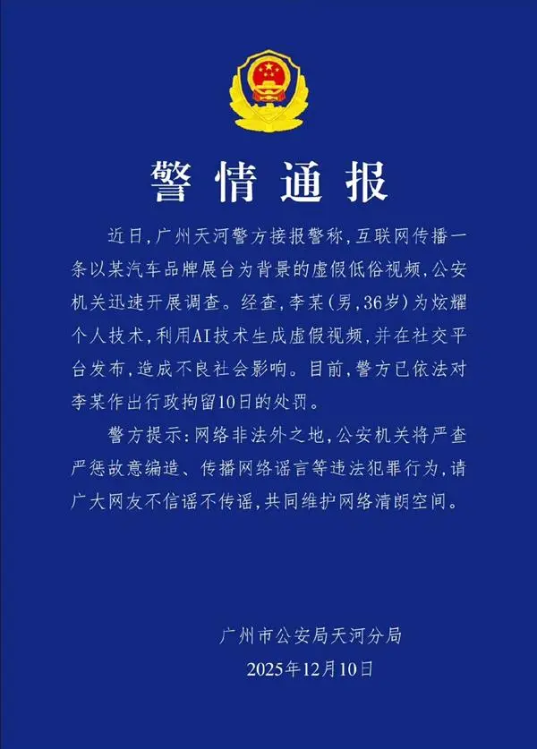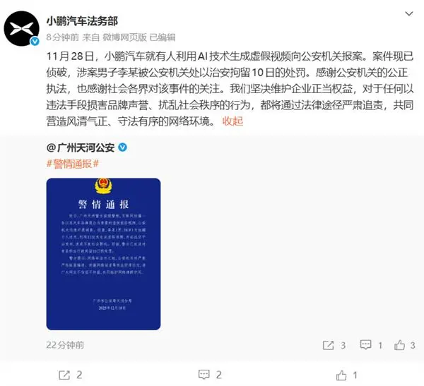 12月10日,小鹏汽车法务部发布通报称,公安机关已对一起利用AI技术伪造低俗视频诋毁企业品牌案件完成侦办。涉案人员李某因制作传播虚假内容被依法处以治安拘留10日处罚。