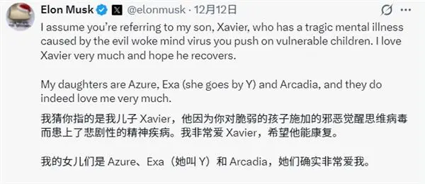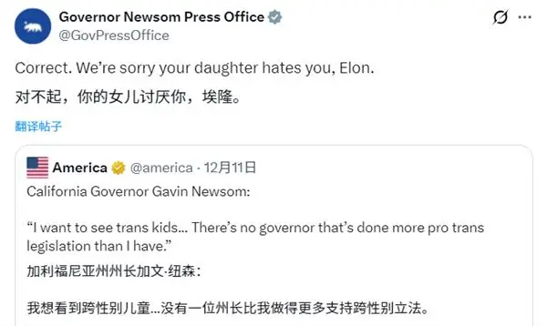 12月12日,纽森办公室官方账号转发该视频时配文"很遗憾你女儿恨你,埃隆",直接引发马斯克激烈回应。马斯克在评论区指出,其长子泽维尔因受"觉醒思想病毒"影响更改性别为薇薇安,并强调这是加州政策导致的"精神疾病"。