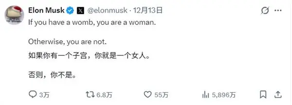马斯克在后续多条推文中明确反对跨性别意识形态,主张生理性别二元论。他于13日置顶声明称:"子宫拥有者即为女性,反之则非",并将"觉醒病毒"与"多元文化主义"列为批判对象。