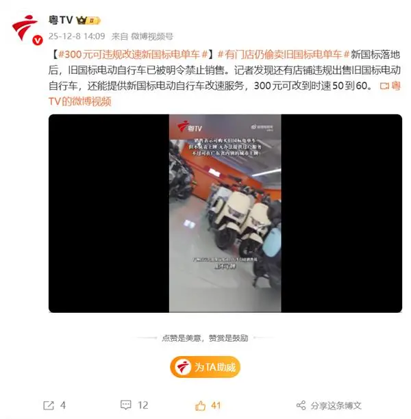新规实施后,部分消费者因对行驶速度有需求,倾向于购买旧国标不限速车型。记者调查发现,仍有门店违规销售无法上牌的旧国标电动车,同时存在提供新国标车改装提速服务的现象。