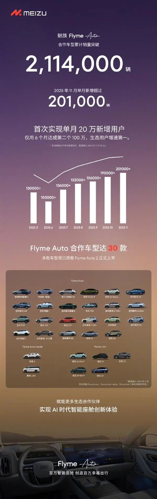 12月11日,魅族科技公布数据显示,其Flyme Auto车载系统在11月单月新增生态用户数达到20.1万,首次突破20万大关。该系统目前累计合作车型30款,相关车辆总销量已超过211万辆。