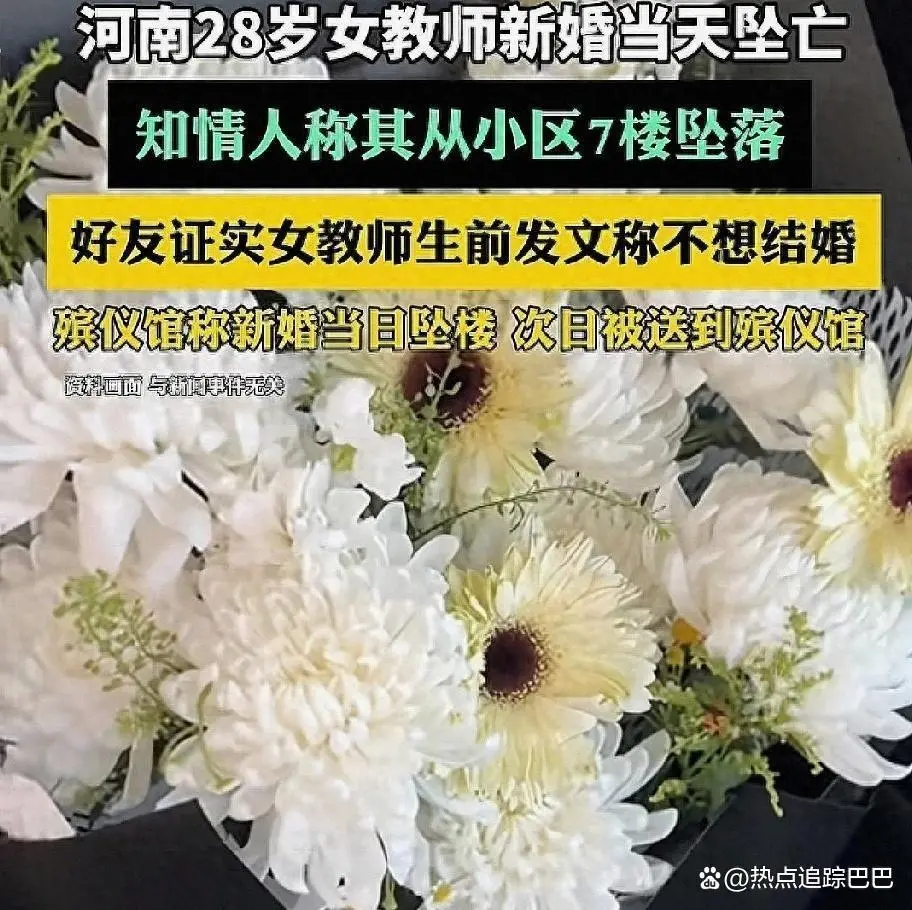 河南鲁山县发生一起婚礼当日坠楼事件,28岁高中历史教师魏某于12月10日从7楼新房坠落至一楼院内身亡。事件引发遗体坠入区域业主的赔偿争议,家属与新郎方对责任认定存在分歧,当地妇联已介入关注。