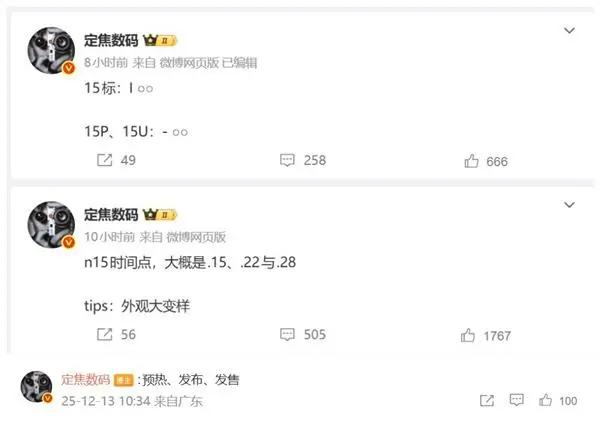 华为终端产品线近期动作频繁,继旗舰机型后,中端nova系列即将迎来更新。据数码博主披露,nova 15系列计划于12月28日前后发布,包含标准版、Pro版和Ultra版三款机型。该系列将于下周启动官方预热流程。