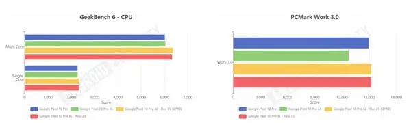 专业科技媒体Androidauthority针对Pixel 10 Pro XL的测试表明,Geekbench 6基准测试中CPU单核性能提升2%,多核性能提升5%。PCMark Work 3.0测试成绩增幅达19.6%,该测试模拟网页浏览、图片编辑等日常使用场景。