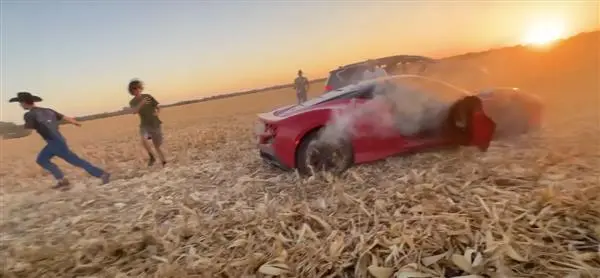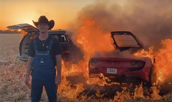 在后续拍摄的视频中,这辆法拉利经历了包括泥地越野、拆除后视镜、装载饲料等非常规使用。最终车辆在玉米地自燃事故中被完全烧毁,相关视频获得超过1600万次播放量。