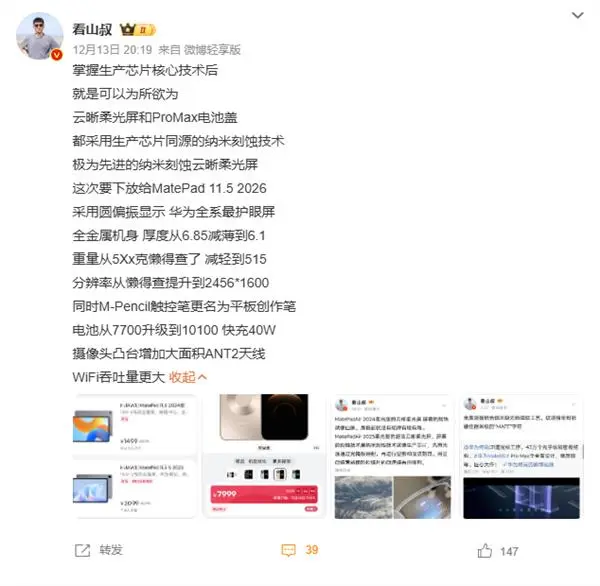 数码博主"看山叔"此前曝光的华为平板参数与新品吻合。爆料显示,该设备采用全金属机身设计,厚度从6.85mm缩减至6.1mm,便携性有所提升。