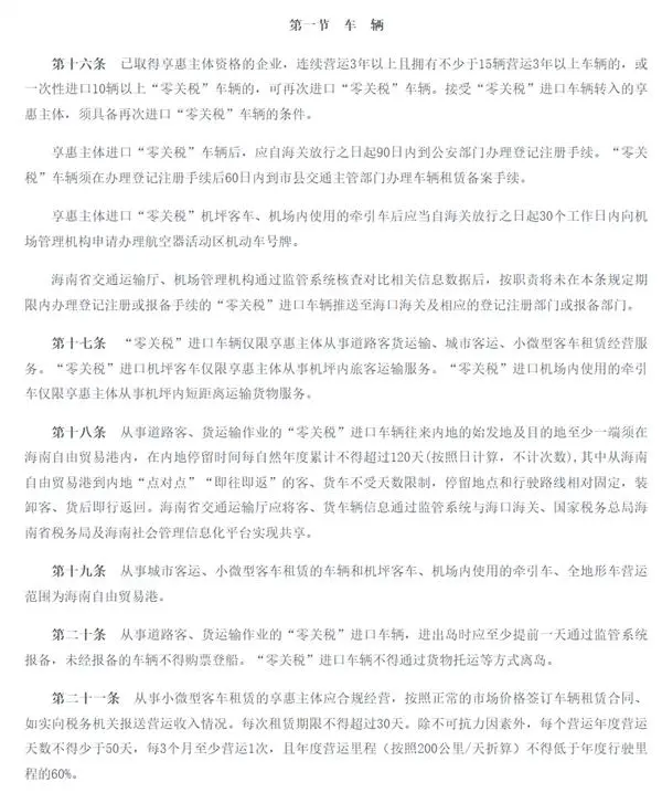 《海南自由贸易港进口"零关税"营运车辆管理实施办法》明确规定,享受该政策的企业须从事交通运输或旅游业,车辆必须用于营运并安装卫星定位系统。企业需满足"15辆营运满3年"或"一次性进口15辆以上"的资质条件。