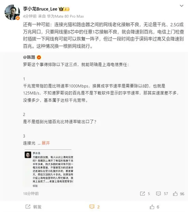 华为终端BG CTO李小龙补充指出,网络设备间的物理连接问题可能引发速率衰减。当光猫与路由器间网线存在单芯接触不良时,系统会主动降速至百兆模式,这种故障具有间歇性特征,需更换全新网线才能彻底解决。