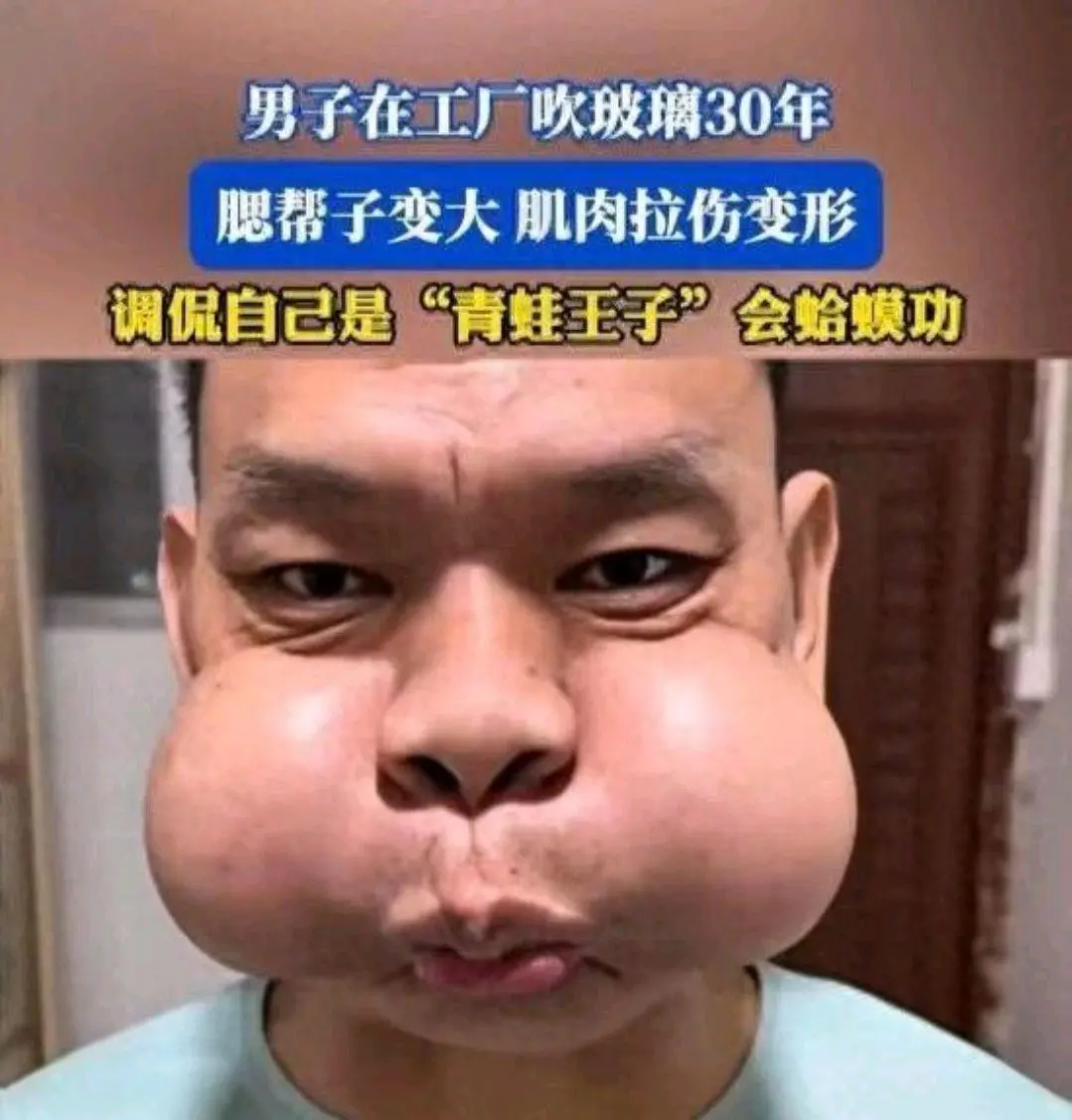 12月16日,广东一名从事手工吹玻璃工作30年的男子因长期职业操作导致面部肌肉变形,引发社会关注。该工匠因长期向高温玻璃吹气,面部肌肉出现异常发达和松弛现象,被网友称为"青蛙王子"。