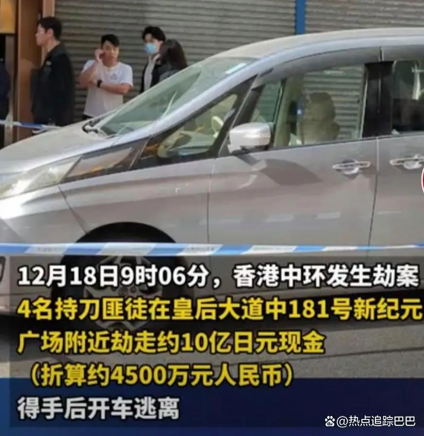 12月18日上午9时06分,香港皇后大道中181号新纪元广场附近发生一起重大抢劫案。4名持刀男子劫走货币兑换店职员运送的10亿日元现金(约合5000万港币),随后乘接应车辆逃离现场。香港警方迅速展开行动,在案发后拘捕一名涉案男子,案件目前由港岛总区重案组调查。