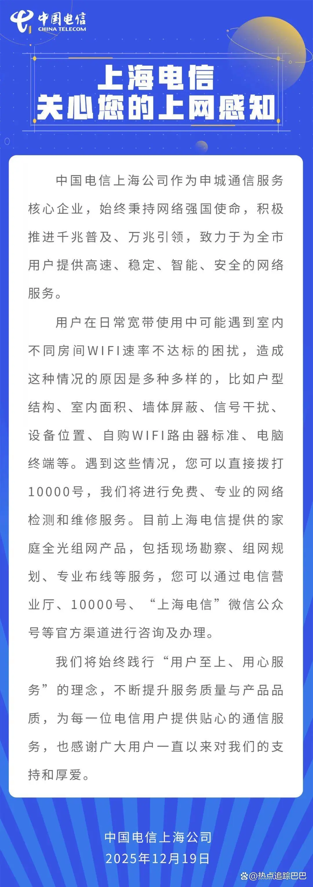 近日,知名人士罗永浩公开反映其在上海使用的中国电信独享千兆宽带存在实际网速长期不足百兆的情况。12月19日晚间,上海电信官方回应称,网速不达标可能涉及户型结构、墙体材质、终端设备等多重因素,建议用户通过10000号客服热线预约免费检测服务。